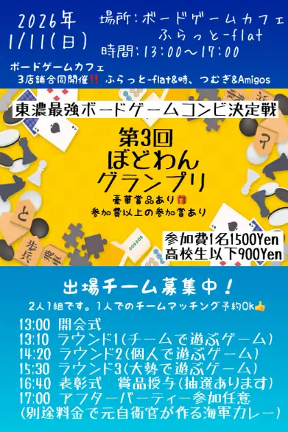今回は「ボードゲームカフェふらっと-flat」様で開催いたします!